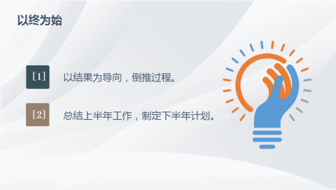 另外,七月份的这个节点,是上半年的结束,下半年的开始,我们通过“以终为始”为指导,去总结汲取上半年的经验,以此更好地做好下半年的计划,进行下半年的工作。